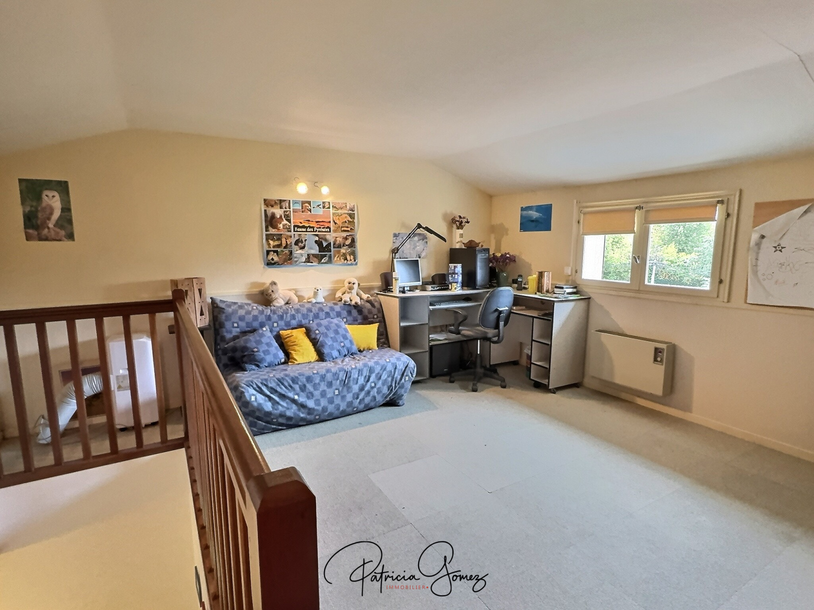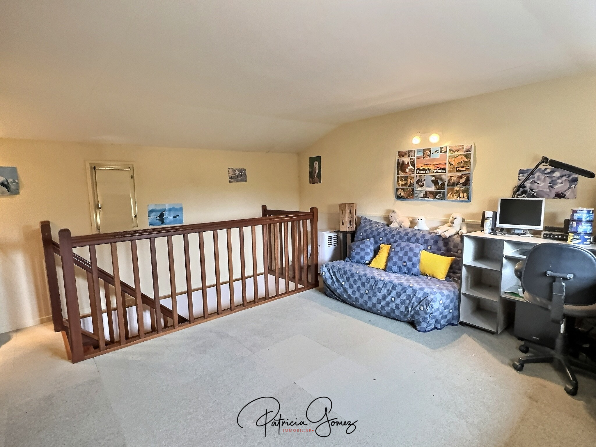 À l’étage, une mezzanine permet différents usages : bureau, espace télétravail ou chambre supplémentaire, complétée par une autre chambre.
